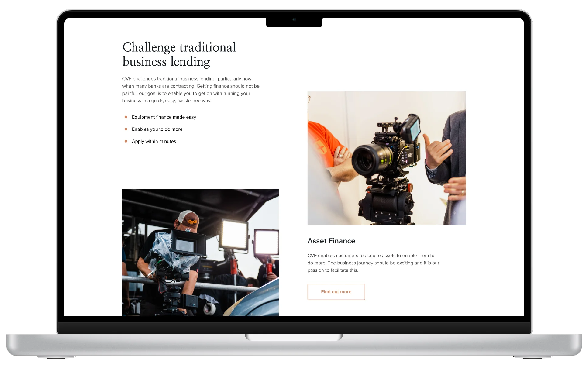 Creative Vision Finance (CVF) was established in 2021 and brought onboard under the CVP umbrella. CVF's unique selling point was to bring a personalised and straightforward approach to asset finance for the film, TV and broadcast sector.